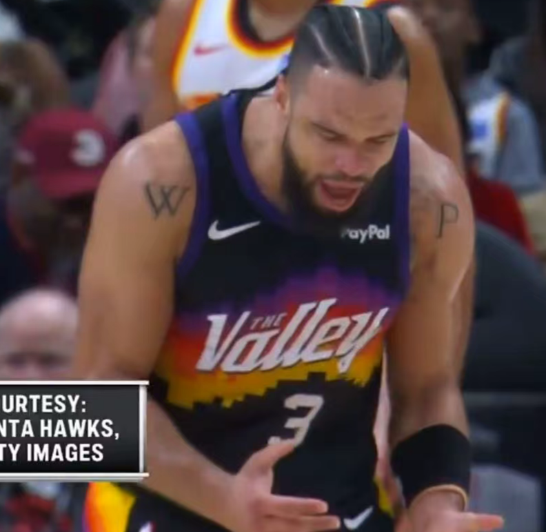 除了杰伦-格林外,太阳最麻烦是太子爷布克也在比赛第三节因伤退赛,慢镜头显示他跑动时踩到奥孔武德脚导致严重崴脚。